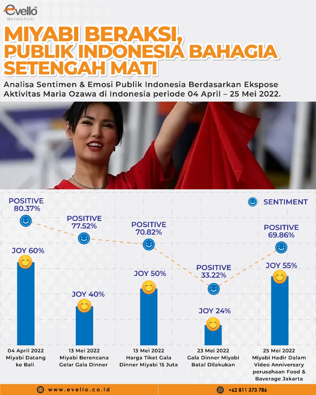 Dimana ada Miyabi, disitu ada kegembiraan. Demikian kesimpulan Evello dalam pantauan terhadap mantan bintang porno asal Jepang, Maria Ozawa alias Miyabi. Latar belakangnya sebagai artis